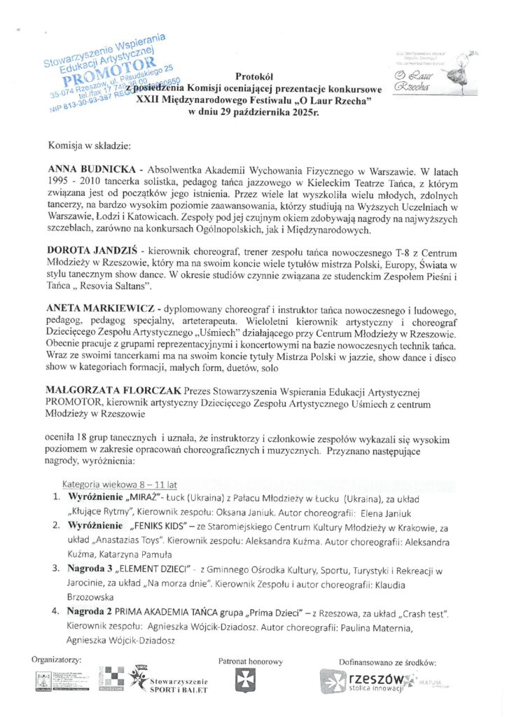 Protokół z posiedzenia Komisji oceniającej prezentacje konkursowe XXII Międzynarodowego Festiwalu „O Laur Rzecha” w dniu 29.10.2025